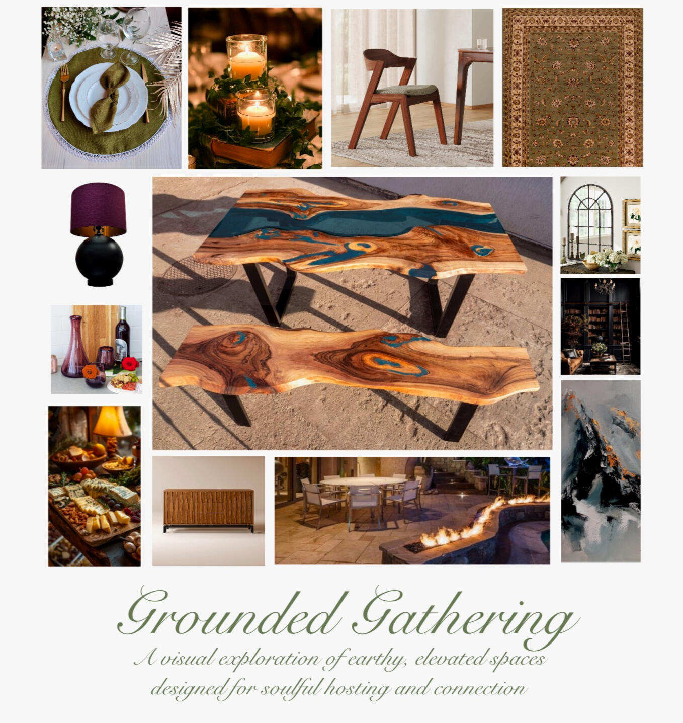 This mood board reflects my aesthetic foundation: earthy, elevated, and deeply rooted in connection. "Grounded Gathering" explores the intersection of natural materials, soulful textures, and rich, layered tones. The palette is designed to create spaces that invite presence and warmth. From sculptural wood grain to olive greens and plum accents, the palette is curated to evoke intimacy, hospitality, and quiet luxury.Each board I create blends visual storytelling with functional intent whether for a residential space, a hospitality concept, or a curated vignette.